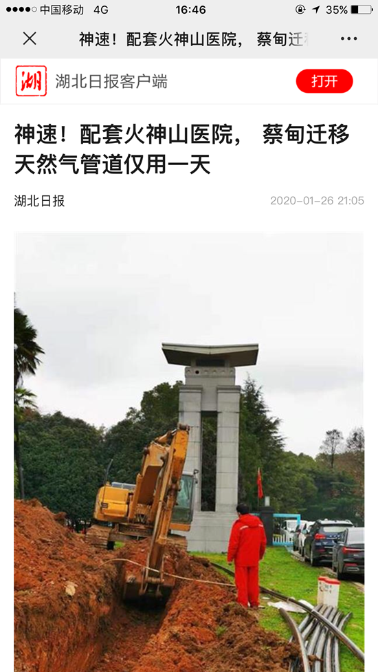 《湖北日報》:神速!配套火神山醫(yī)院,蔡甸遷移天然氣管道僅用一天
